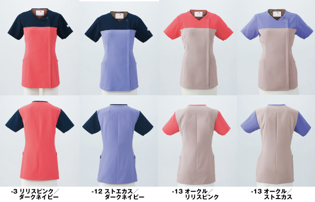 おしゃれなバイカラーに加え、肩から脇にかけての大きな動作に対応するように生地の伸縮方向を設計。