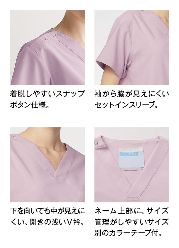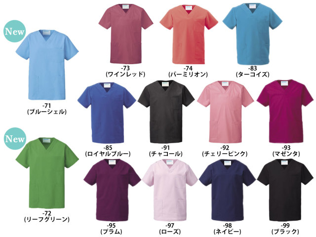 シーンに合わせて選べる、美しい発色にこだわった15色のスクラブ。吸汗速乾性に優れ、シンプルで機能的なデザイン。